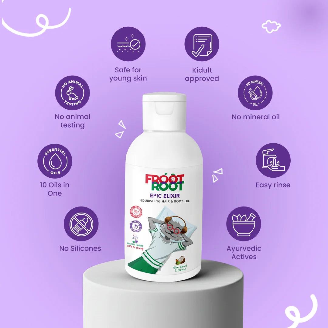 A kids hair has moods, frizzy one day, dry the next. Elixir Hair Oil brings Fruit Ayurveda goodness in a light, non-sticky formula that fits right into their routine. Made with a nourishing blend of 10 oils, it strengthens, softens, and keeps up with all the running and outdoor chaos, making it one of the best hair oils for kids